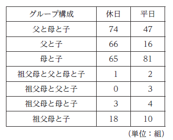 2. 平日においては,父親が含まれる子ども連れのグループの数は,母親が含まれる子ども連れのグループの数の3 割より少ない。