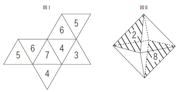 スポンサーリンク 2020 刑務官 No.14 Twitter Facebook はてブ Pocket LINE コピー 2026.02.20 図Ⅰは,各面に数字が書かれた正八面体の展開図である。これを組み立てた正八面体について,図Ⅱのように,平行に向かい合う面の数字が合計して10 になる面の組合せは何組あるか。 1. 0 組2. 1 組3. 2 組4. 3 組5. 4 組 PR 株式会社クレアール模擬面接、面接カード対策も万全、刑務官試験に向け充実のサポート体制。資料請求! 解説 正答 2 正八面体の向かい合う面は、展開図では間に2枚の面を挟んだ面同士である。したがって、5-4、6-3、5-7、6-4の四つである。合計が10になるのは一組である。
