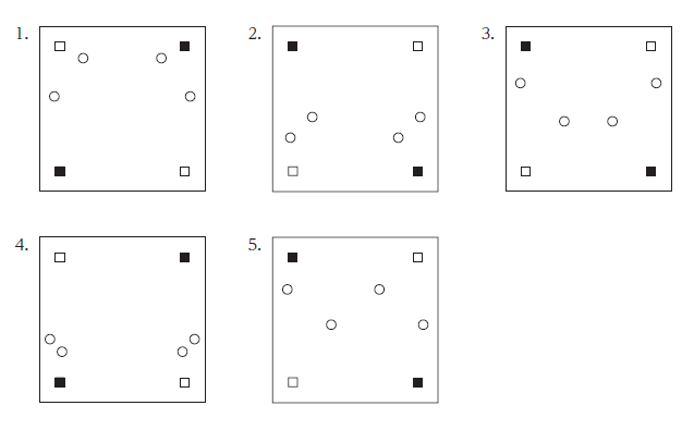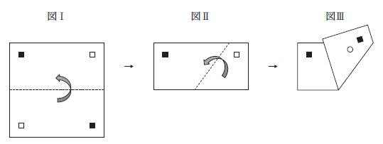 スポンサーリンク 2021 刑務官 No.13 Twitter Facebook はてブ Pocket LINE コピー 2026.02.18 図I のような,四隅に□と■の印が付けられた正方形の折り紙があり,□の裏側には■,■の裏側には□の印が付けられている。この紙を,図I →図Ⅱ→図Ⅲの順に,破線で2 回谷折りした後,図Ⅲに示すように丸い穴を開けた。この紙を広げたときの模様として最も妥当なのはどれか。ただし,回転したり裏返したりして同じ模様になるものは同一のものとする。 PR 株式会社クレアール模擬面接、面接カード対策も万全、刑務官試験に向け充実のサポート体制。資料請求! 解説 正答 1 図3から順に戻して作図をしていく。図Ⅰを左回転させると選択肢1となる。