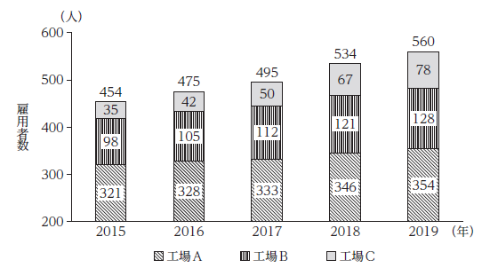 - 2019 年における工場全体の雇用者数に占める工場Cの雇用者数の割合は,2015 年におけるそれの3 倍以上である。