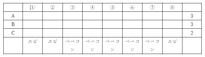 ○ トッピングはベーコンとエビの2 種類であり、③、④、⑤、⑥、⑦にはベーコンだけがトッピングされており、⑧、①、②にはエビだけがトッピングされていた。