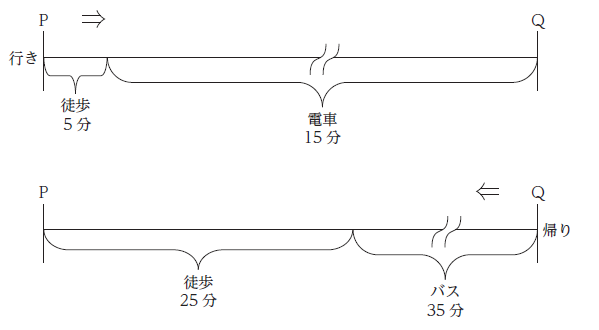 Aが、図のように、地点PQ の間を往復した。行きは、初め徒歩で5 分間移動し、途中から電車に乗って15 分間移動した。帰りは、初めバスに乗って35 分間移動し、途中で下車して徒歩で25 分間移動した。帰りにバスに乗って移動した距離は、行きに徒歩で移動した距離の56 倍だった。