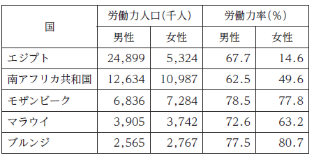 表は、アフリカの5 か国における2021 年の男女別労働力人口と労働力率を示したものである。これから確実にいえることとして最も妥当なのはどれか。