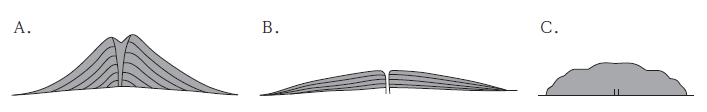 図のような3 種類の形の火山の噴火を比べた場合にいえることとして最も妥当なのはどれか。なお、火山の大きさは考えないものとする。