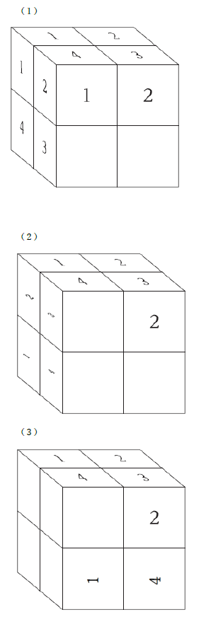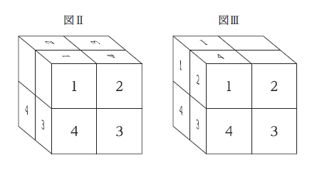 小立方体8 個が連結されて出来た大立方体がある。この大立方体の三つの面にだけ、図Ⅰのように、小立方体の一つの面に対して一つの数字が書かれている。また、この大立方体は、小立方体4 個を1 組として上下左右の方向に回転できるようになっており、例えば、上の段を右に90°回すと図Ⅱのようになり、正面から見て右側を下に90°回すと図Ⅲのようになる。