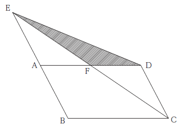 図のように、平行四辺形ABCD の、線分BA の延長上にAE =AB になるように点Eをとり、AD とCE の交点をF とする。三角形DEF(斜線部)の面積が2 であるとき、平行四辺形ABCD の面積はいくらか。
