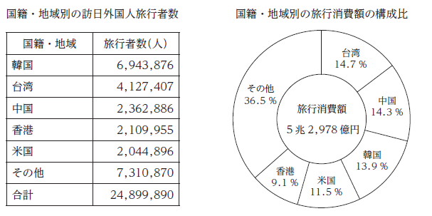 5 誤り。台湾よりも韓国の方が訪日者が多いのにもかかわらず、支出額の占める割合が少ないので、一人当たりの消費額は韓国の方が少ない。