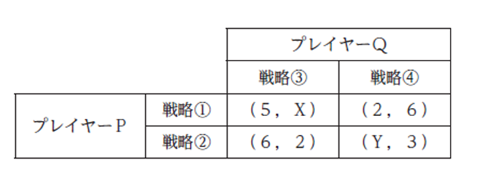 D.プレイヤーQが最初に戦略を選択する完全情報の展開形ゲームでは、X=1 、Y=1 のとき、部分ゲーム完全均衡におけるプレイヤーQの利得は6 である。