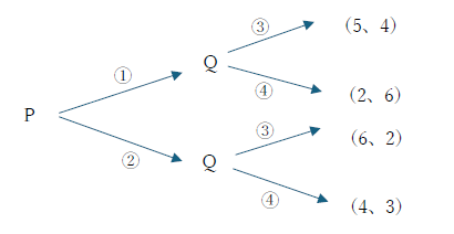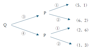 部分ゲーム完全均衡は、戦略①、④の組み合わせである。したがってプレイヤーQの利得は6である。