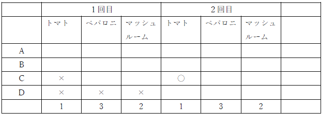 人数から1回目のペパロニをトッピングした人が決まり、アの条件より2回目のペパロニをトッピングした人も決まる。また2回目のトマトはCだけであり、エの条件よりCは1回目にはマッシュルームをトッピングしていないことがわかる。1回目のマッシュルームをトッピングした人も確定する。