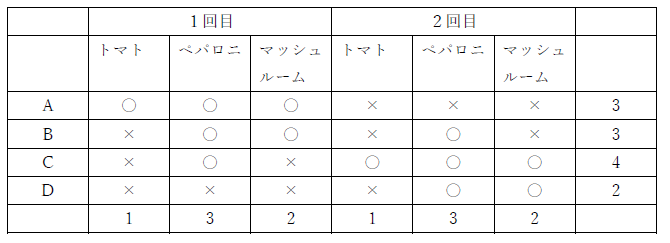 エ 1 回目にマッシュルームをトッピングした人は、2 回目にトマトをトッピングしなかった。