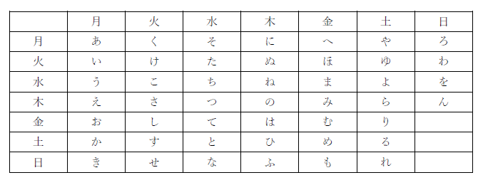 「やよい」において、「や」と「よ」は同じ「や」行であり、暗号を見ると同じ要素の「土」が含まれている。50音表を使うのは正しそうである。しかし、ここで問題となるのは50音表の場合は、縦5行、横10行で描くのが通常であるが、それだと、月から土までの7文字では横の行が表せない。そこで曜日は7つあることより、7文字ずつで改行すると仮定して表を作ると次のようになる。
